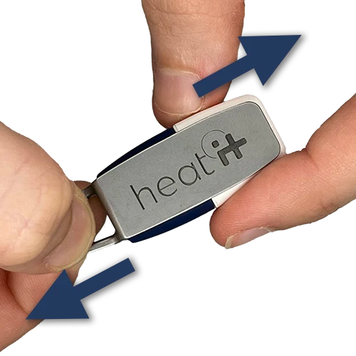 1) Open: Hold the metal cap by the key ring with one hand. Pull the heat it® with the other hand.
